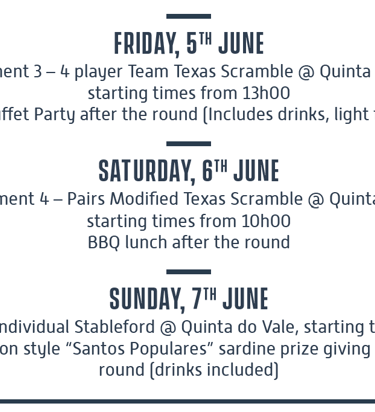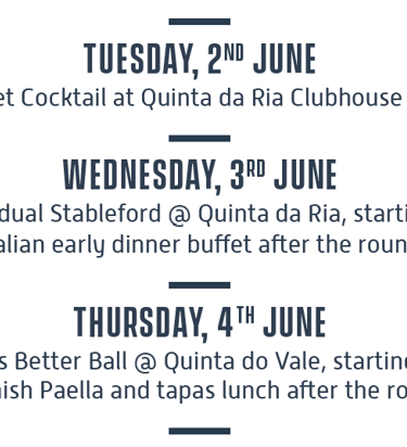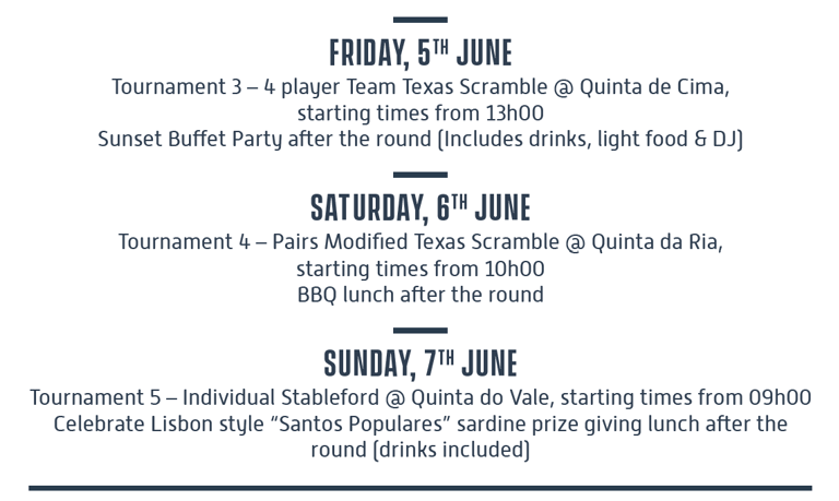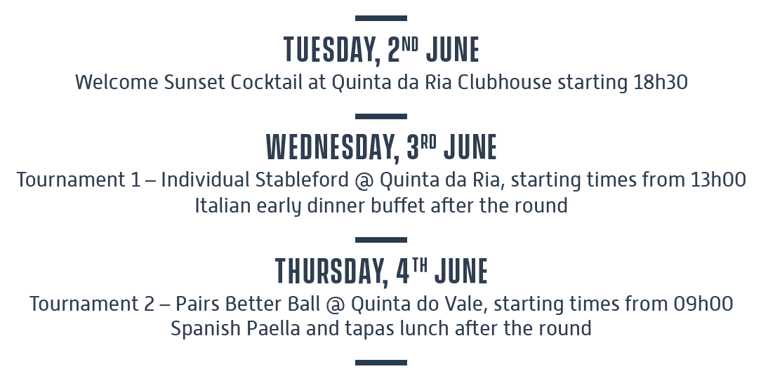 5 rounds of golf tournament at Quinta da Ria (2), Quinta do Vale (2) and Quinta da Cima (1) Welcome Sunset cocktail reception on 2 June